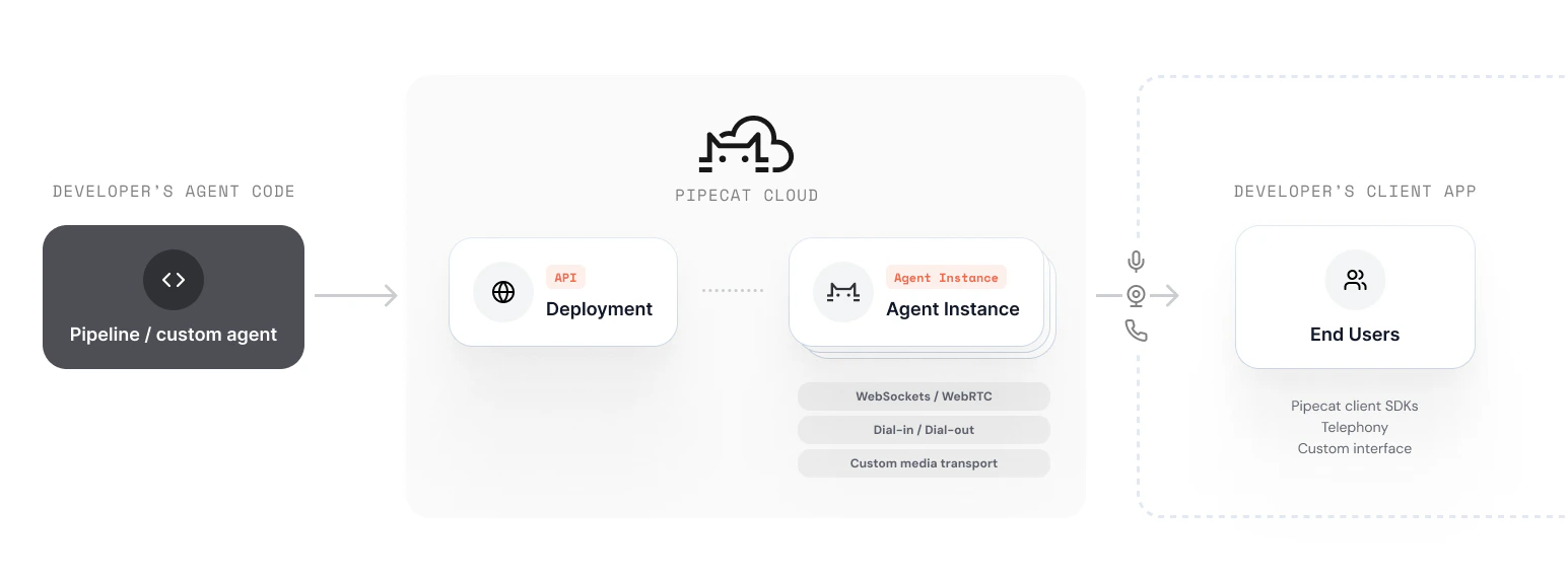 Pipecat Cloud is a managed platform for hosting and scaling AI agents into production. Purpose-built for the Pipecat framework, Pipecat Cloud makes it easy for developers to deploy Pipecat pipelines or custom agentic workflows.